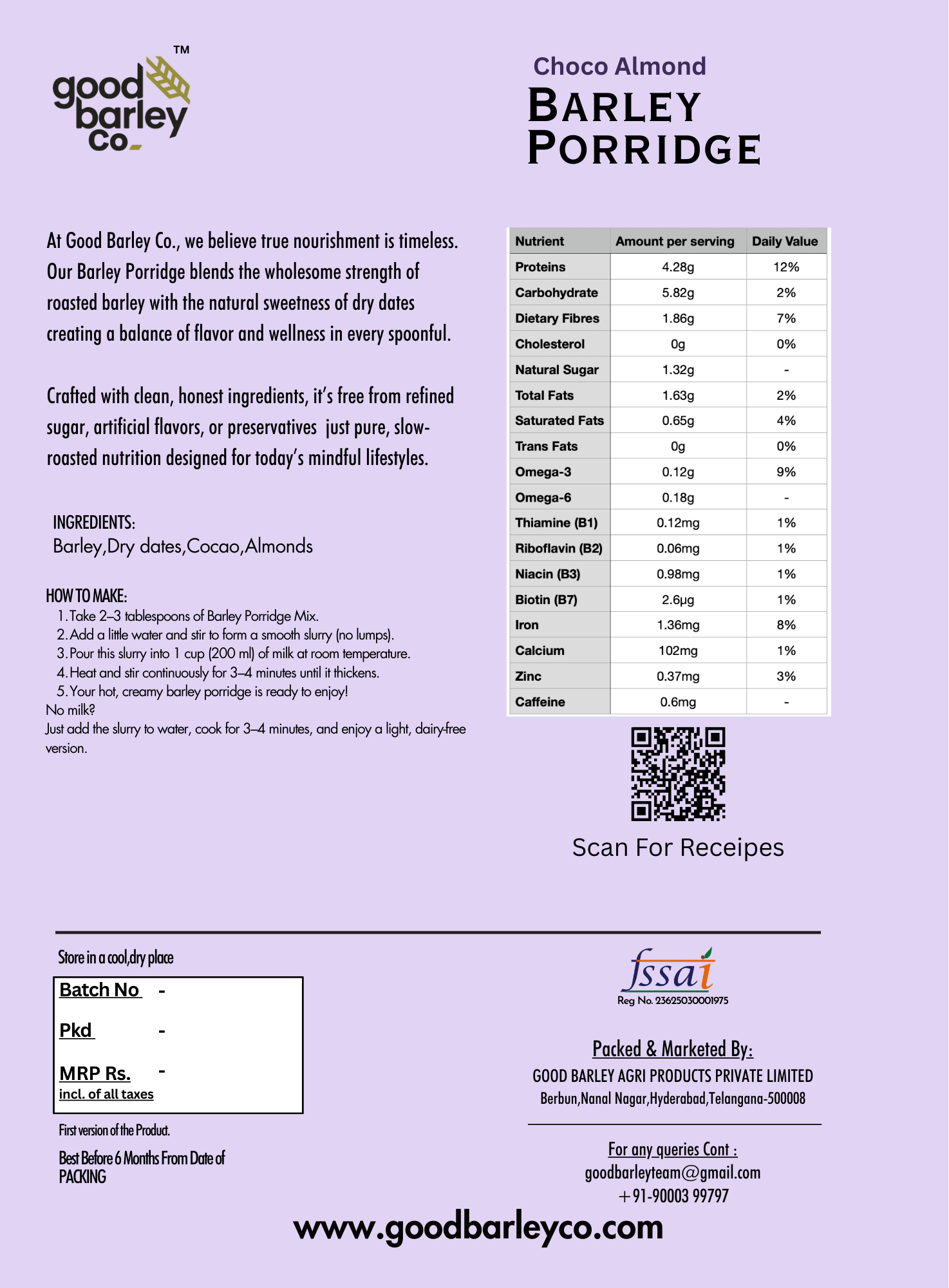 Choco Almond Barley Porridge combines the goodness of barley and dry dates with rich cocoa and crunchy almonds for a chocolatey bowl you can feel good about. It delivers the comfort of hot chocolate with the nourishment of a High-Fibre, Low GI porridge perfect for kids, chocolate lovers, and anyone looking for a healthier sweet fiX.
