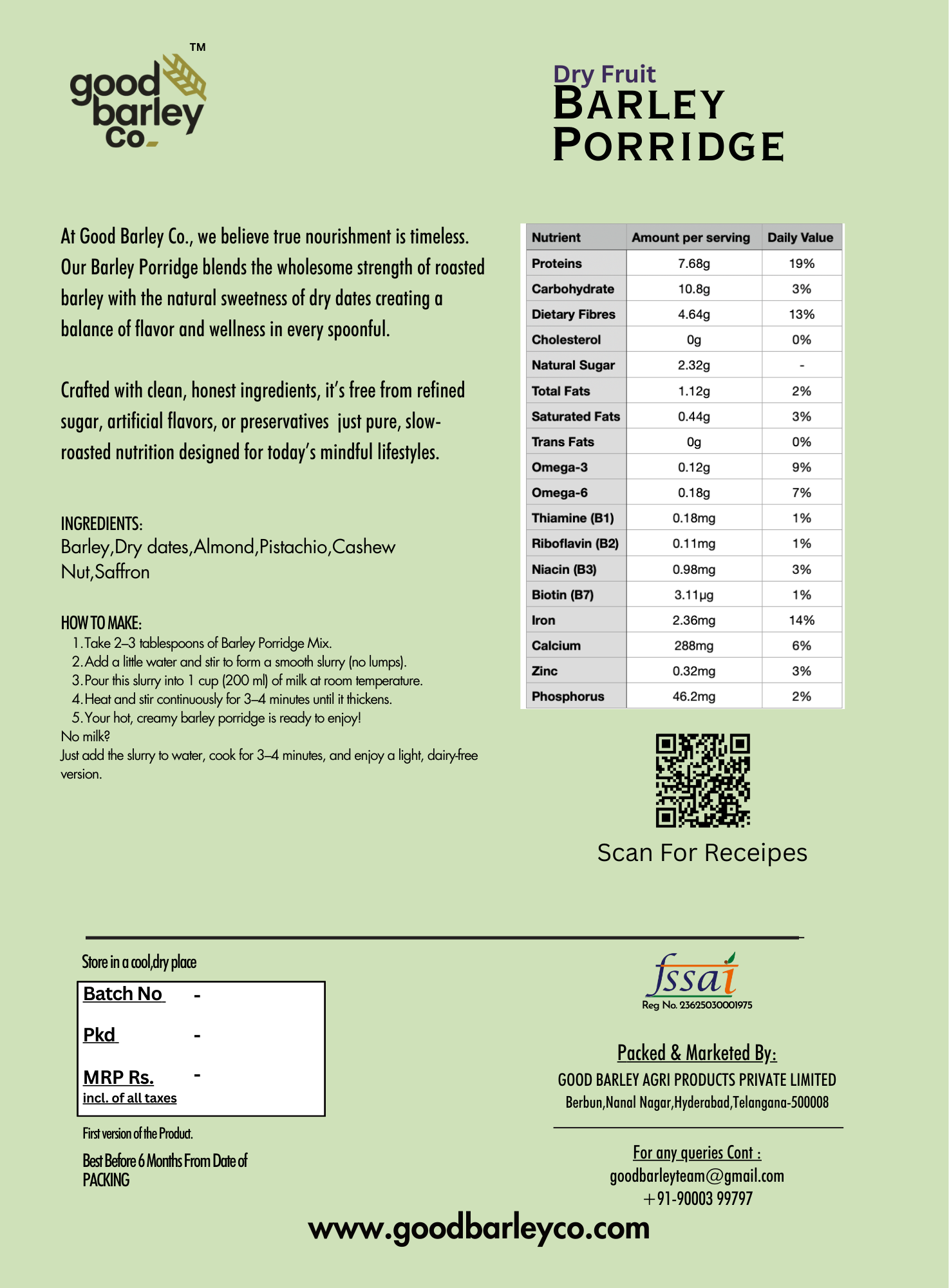 The Dry Fruit Barley Porridge upgrades your daily bowl with a generous mix of almonds, cashews and pistachios, paired with dry dates and roasted barley. Every spoonful offers layers of crunch and natural sweetness, while still being a Low GI, High-Fibre meal that supports steady energy through the day.